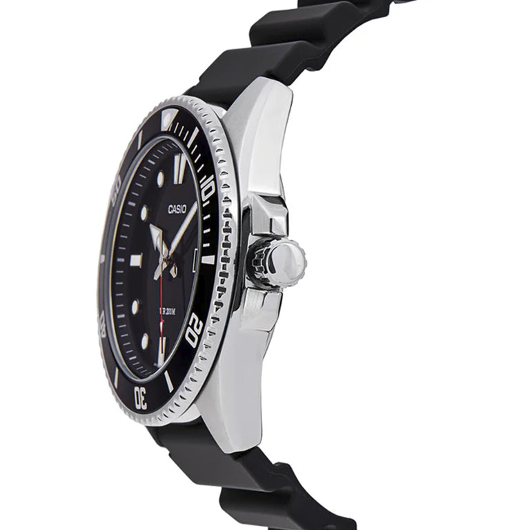 Los MDV-107 de Casio son unos relojes tipo diver de estilo clásico, el equivalente europeo al clásico “Marlin”. Cada modelo combina simplicidad funcional con robustez. Su diseño analógico con bisel giratorio unidireccional y resistencia al agua hasta 200m lo hace apropiado tanto para natación y buceo recreativo como para el uso diario. La esfera negra con índices y agujas luminiscentes permite una lectura clara en cualquier condición, y la ventana de fecha aporta utilidad práctica. La correa de resina ofrece comodidad prolongada, y su construcción sólida te garantiza fiabilidad sin complicaciones.